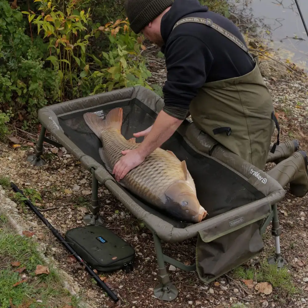 Es gibt sechs höhenverstellbare Optionen an den Beinen, um die Wiege je nach Bedarf zu heben oder zu senken, sowie drehbare Schlammfüße, um die Wiege auf unebenem Gelände waagerecht zu halten. Eine große Aufbewahrungstasche und ein Gummietikett, das die Karpfenpflege erklärt, sind auch im Lieferumfang enthalten. Die Wiege lässt sich schnell aufstellen und einpacken und kann zum flachen und einfachen Transport in der mitgelieferten Tragetasche ordentlich zusammengefaltet werden.